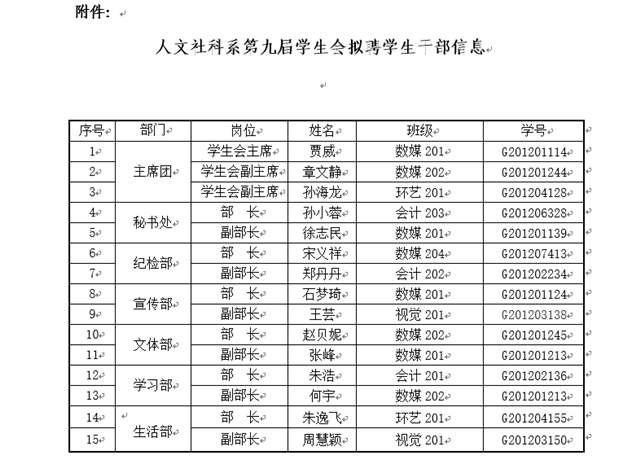 为进一步加强学生会组织建设,切实加强学生干部队伍建设,充分发挥学生自我教育、自我服务、自我管理和自我监督的作用,促进学生会工作的全面发展,本着“公平、公正、公开、竞争、择优”的原则,人文社科系学生会组织开展了2021年主要学生干部换届竞聘工作,通过学生自主报名、组织推荐、资格审查、竞选答辩、综合考察等环节,结合学生日常工作能力表现、征集有关教师、辅导员意见后,经研究,决定拟聘贾威等15名同学为人文社科系第九届学生会主要学生干部。